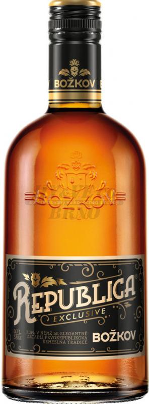 Božkov Republica Exclusive Rum 0,5l 38% - První republika je obdobím noblesy a elegance, poctivosti a hrdostina na řemeslný fortel a um, kterými jsme proslulí. Božkov republika exclusive je oslavou těchto prvorepublikových hodnot. Lahodný třtinový rum plné a následné chuti a tmavě jantarové barvy si nejlépe samotný a při pokojové teplotě s těmi, na kterých Vám záleží. Tento blend až 8letých rumů z Nikaraguy, Dominikánské republiky, Barbadosu a Jamajky doladěný třtinovým cukrem má jemnou nasládlou chuť s tóny vanilky, sušeného ovoce a oříšků.