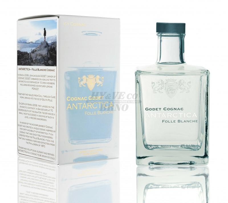 Godet Antarctica Folle Blanche je první komerční čirý koňak na světě. K jeho výrobě byla použita pouze odrůda hroznů Folle Blanche a své čirosti vděčí čistě přirozenému procesu filtrace.