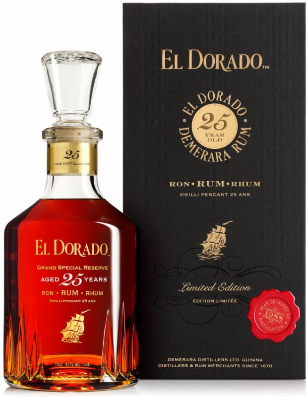Tento 25letý El Dorado byl vytvořen na přelomu tisíciletí a má hedvábnou jemnost, která by mohla soupeřit s nejstaršími koňaky. Neustálé horko a tropické podmínky v Demerara dramaticky urychlují proces stárnutí, které probíhá v amerických dubových sudech po dobu nejméně 25 let.