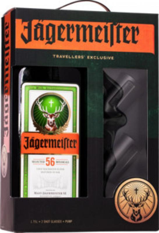 Skvělý německý bylinkový likér Jägermeister, který se nachází v dárkovém balení v láhvi o objemu 1,75 l spolu se dvěma skleničkami a pumpou.