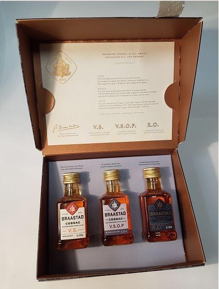 Dárková kolekce francouzských koňaků značky Braastad obsahuje produkty VS, VSOP a XO. VS - překvapí vás svou delikátní ovocnou chutí s buketem vyzrálého ovoce a jarních květin, průměrné stáří koňaků je 4-7 let. VSOP - průměrné stáří koňaků je 6-10 let. Excelentně vyvážená chuť po dubu a exotických květinách, lehké harmonické aroma s tóny vanilky a pražených mandlí. XO - je elegantní koňak velmi vyváženého aroma, ve kterém můžeme cítit tóny čerstvého ovoce a lesních květin. Chuť je harmonická, příjemně plná a svěží. V závěru můžeme opět cítit čerstvé ovoce a jemnou, přetrvávající sladkost.
