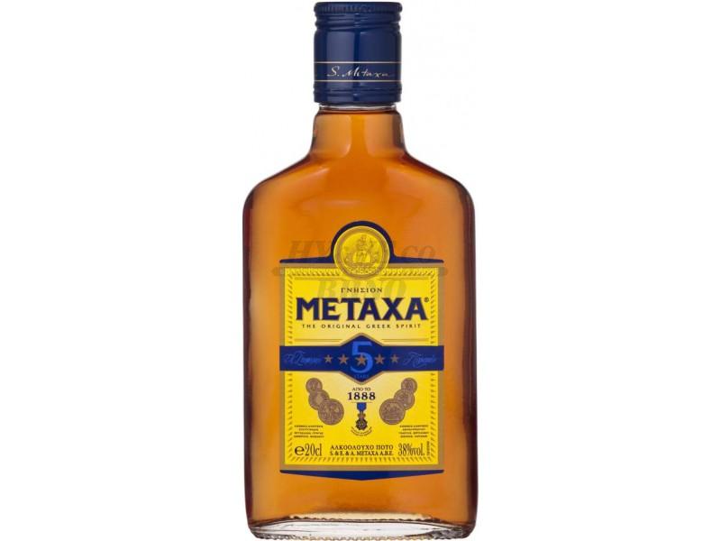 METAXA 5° 0,5l 38% je směs vinné brandy (z tří definovaných variet) a muškátového vína, do níž je přidána směs bylin (zahrnuje např. růžové lístky, další ingledience jsou tajné).