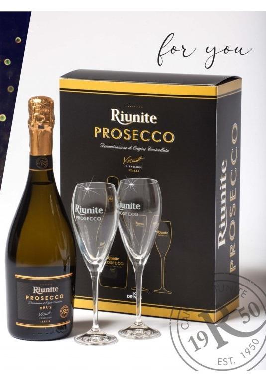 Okuste toto spumante – intenzivně perlivé italské Prosecco – z vinných sklepů Riunite. Víno je světle žluté, slámové barvy. Lehké aroma bílých květů je v příjemné harmonii se svěží, ovocnou chutí. Elegantní černý dárkový box obsahuje i dvě originální prosecco sklenky Riunite. Sklenice mají kalich tulipánového tvaru.