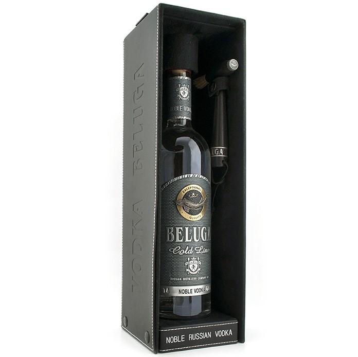 Beluga Gold Line je pětkrát filtrovaná, s mimořádně jemnou chutí. Korek je zalitý voskem a každá láhev má u sebe kladívko a štětec pro rituální servis. |