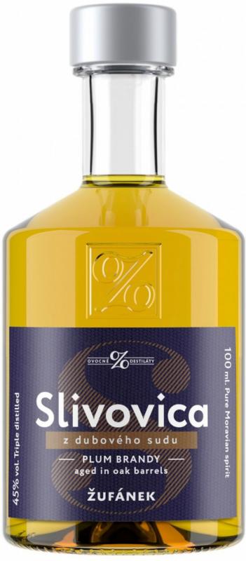 Žufánek Slivovica 0,1l 50% mini Slivovice je ovocný destilát s chutí a vůní po švestkách. Vyrábí se z vyzrálých švestek s pevně stanovenými poměry odrůd a tím je zajištěna originálnost pravé slovácké slivovice. Je to složitý a dlouhý proces. Nejdříve se připraví kvas, to je nejdůležitější prvek ve výrobním procesu a poté následuje řízená destilace. Slivovice je prodávána v originálních skleněných lahvích.